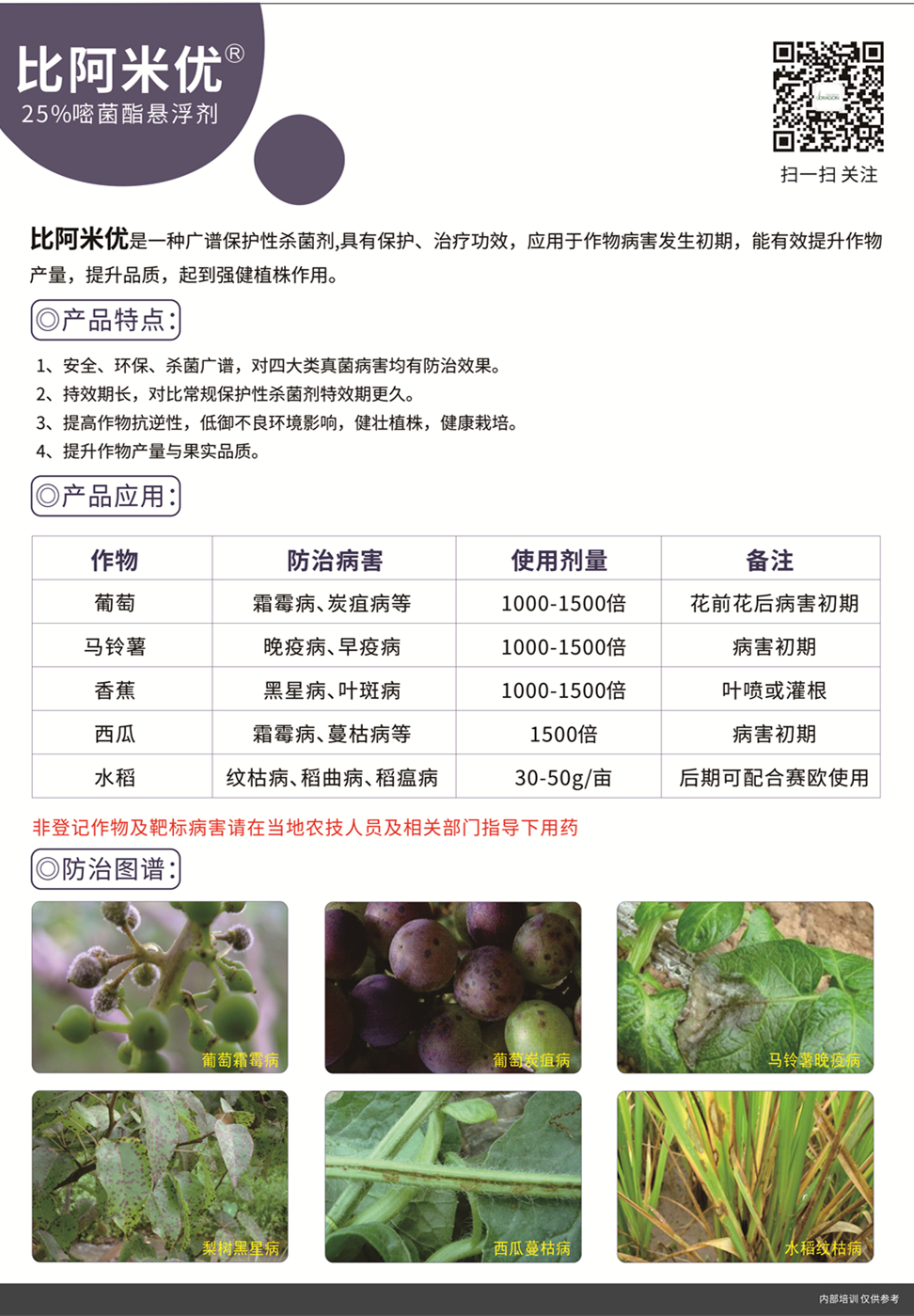 防治对象:杀菌谱广,对大多数真菌病害有效;尤其针对葡萄霜霉病,白腐病,西瓜蔓枯病,马铃薯晚疫病应用效果得到更多认可;